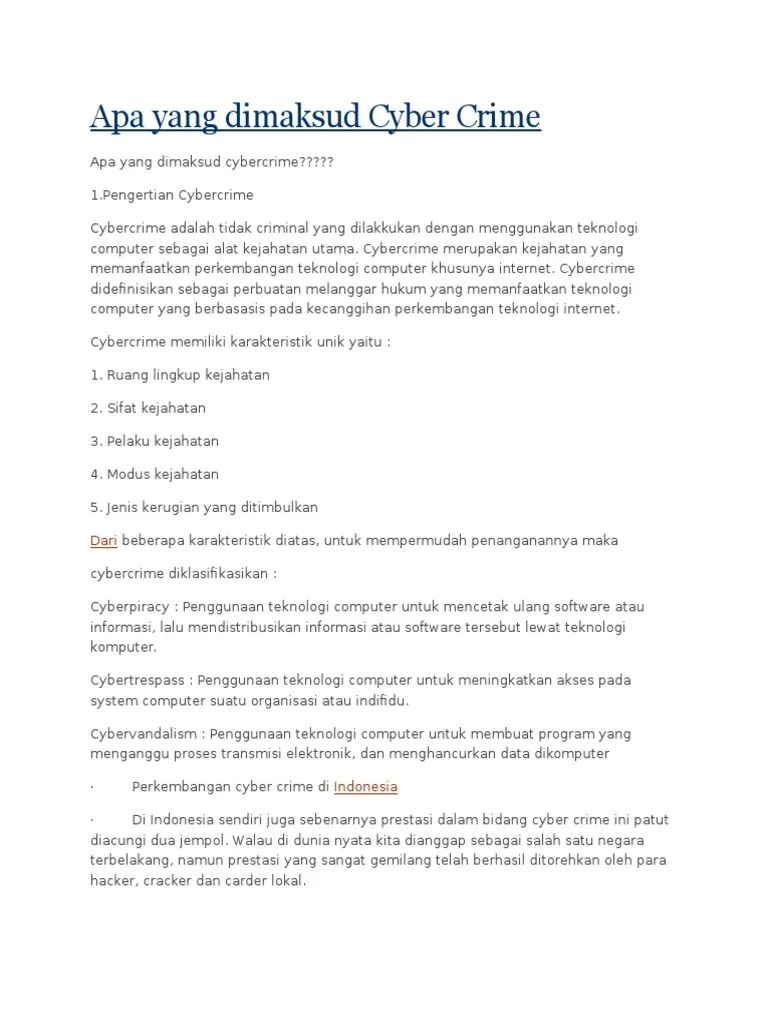 Cyber crime atau kejahatan dunia maya adalah suatu tindakan ilegal yang dilakukan melalui jaringan komputer dengan media internet untuk .